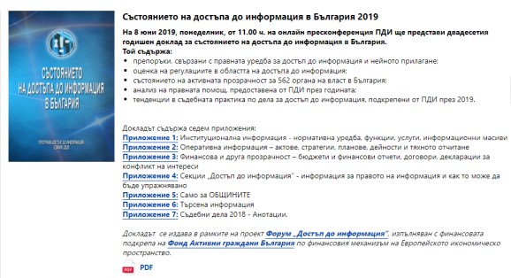 На 7 май 2020, на онлайн пресконференция, Програма Достъп до Информация представи резултатите от годишното си проучване чрез оценяване на Интернет страниците и подаване на електронни заявления до административните структури в системата на изпълнителната власт. През 2020 проучването се осъществява в рамките на проекта Форум „Достъп до информация“, който се изпълнява с финансовата подкрепа на Исландия, Лихтенщайн и Норвегия по линия на Финансовия механизъм на ЕИП.